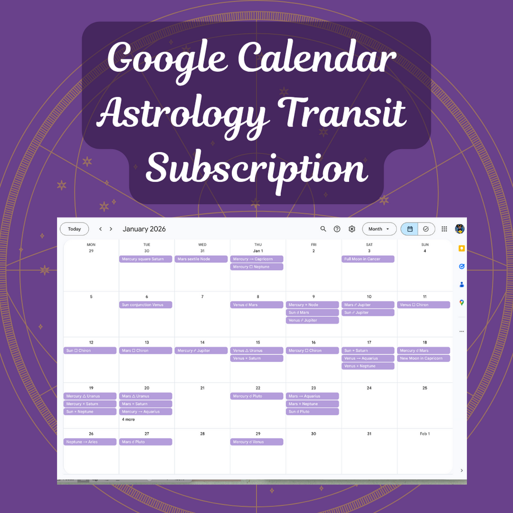 With this Google Calendar Transit subscription, you can get daily transits each month right on your phone or web browser! If you’re looking to dive deeper into your daily relationship with astrology or you just want to keep track of the daily vibe, this Calendar can help you stay up to date on the planetary motions and energy shifts.